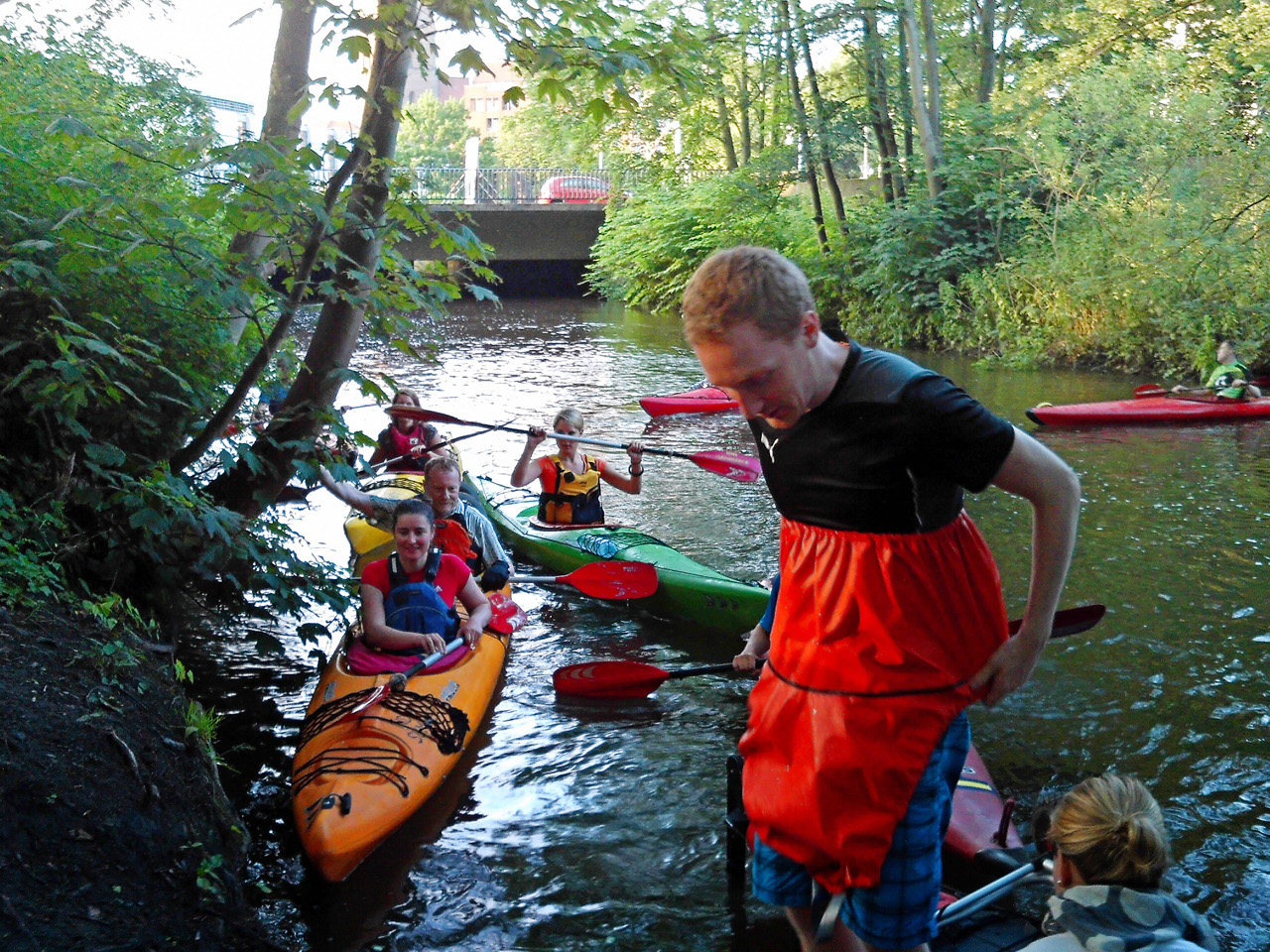 Greater Circuit, June 15, 2014One night I asked Conny if we could take a double kayak together, and to my surprise she agreed, so that we have been partners in kayak ever since. When Conny was out skating or was on her summer programme, I took on a student, Julia, who barely made a dent on a pair of scales, and was not much help in moving forward, and on other times I have taken a solo boat on the course. Eventually we also made it around the Greater Circuit (Leine River to Garbsen, and back along the canal system, 32 km) twice in the course of the summer, although the distance is a little misleading: The first 18 km are downriver at speeds of up to 11 km/h, and the rest is very flat with little current to paddle against. But lots of blackberries to be harvested.