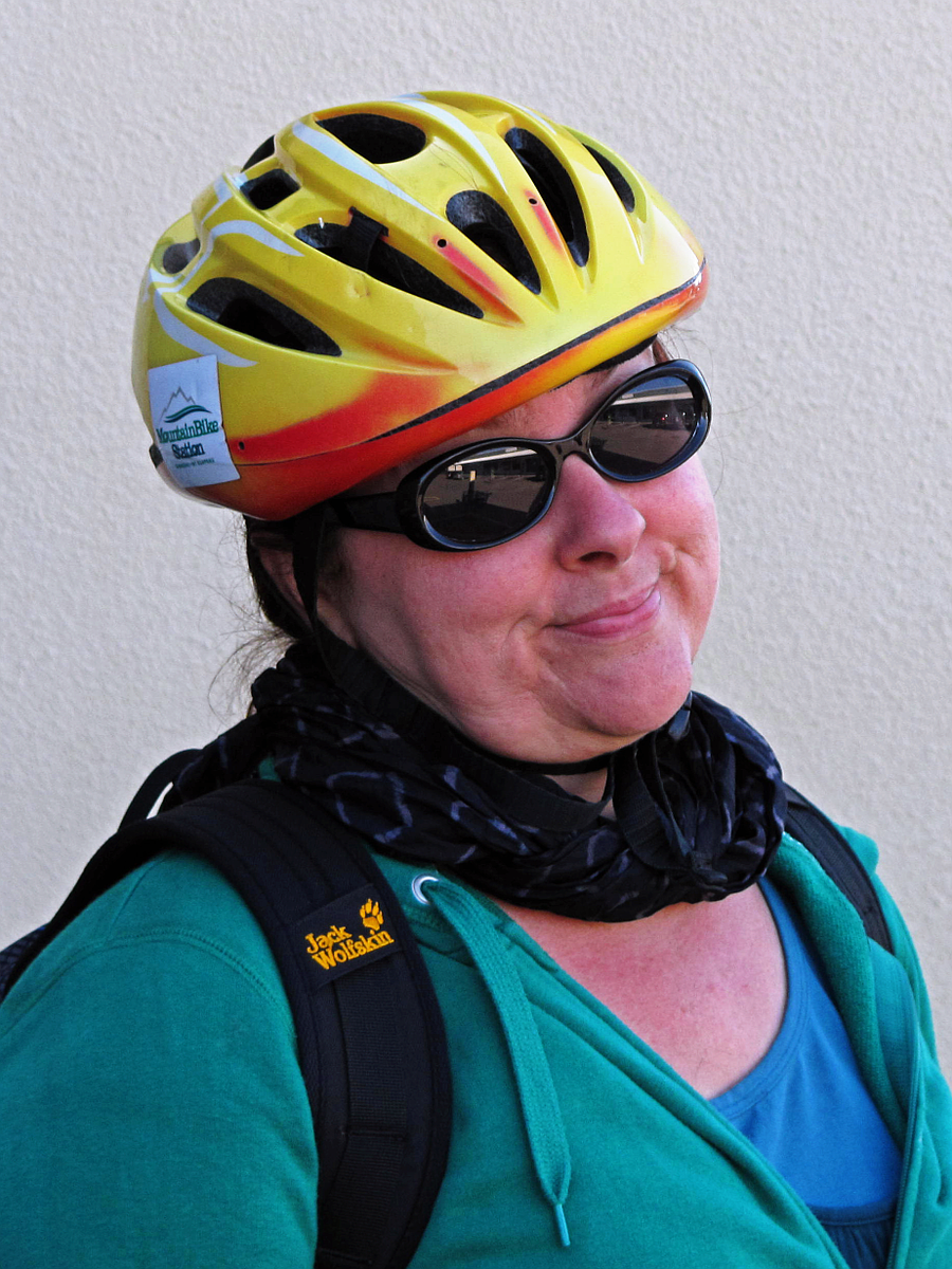 Simon was waiting for us and offered to take Pea along as well, so we were soon off up the hill. Also on offer was a bike (and helmet), and the hostel had the corresponding equipment for Pea as well, so we met at the corner where the Powderhorn is, and cycled into town for some shopping. For Pea it was the first time wearing a helmet, so I took a photo of her. After that we agreed to go out to the Powderhorn to eat. My choice of potato wedges with bacon, cheese and sour cream as a snack for $12 was overpowering (especially after the burger lunch), and I barely made a dent in it, Pea’s choice of corn chips with spicy avocado and jalapeño dip for $6.5 and a side of beans for $8 seemed more doable. We had the spuds bundled up to take away. Will have to come back here when hunger strikes.
