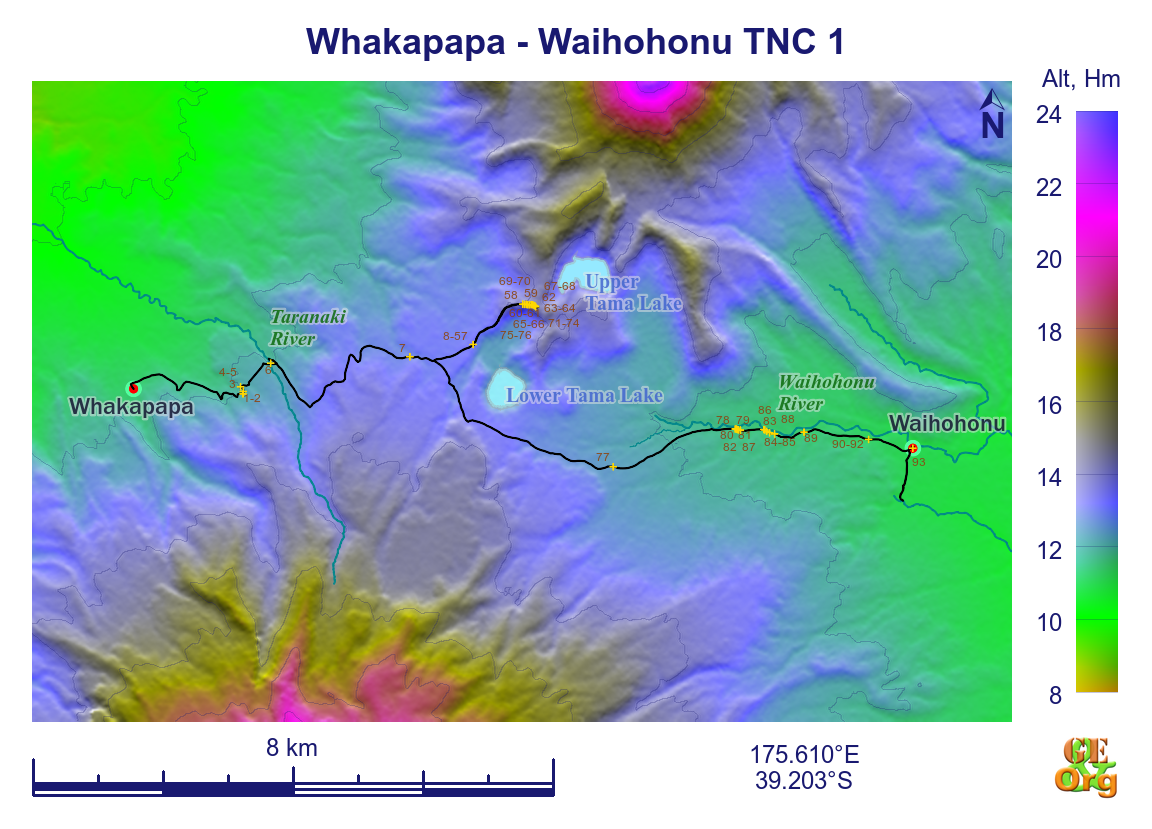 A lot of young Americans here who were doing Baywatch at Waihohonu for a greeting. Found a lower bunk bed and occupied it, then it was down to Ohinepango Springs (6°C) for some potable water (track is on GPS as an extra). Had an early dinner (5:00) of one packet of instant noodles and half a cup of rice that had been precooked and dumped into the bowl for the interim.