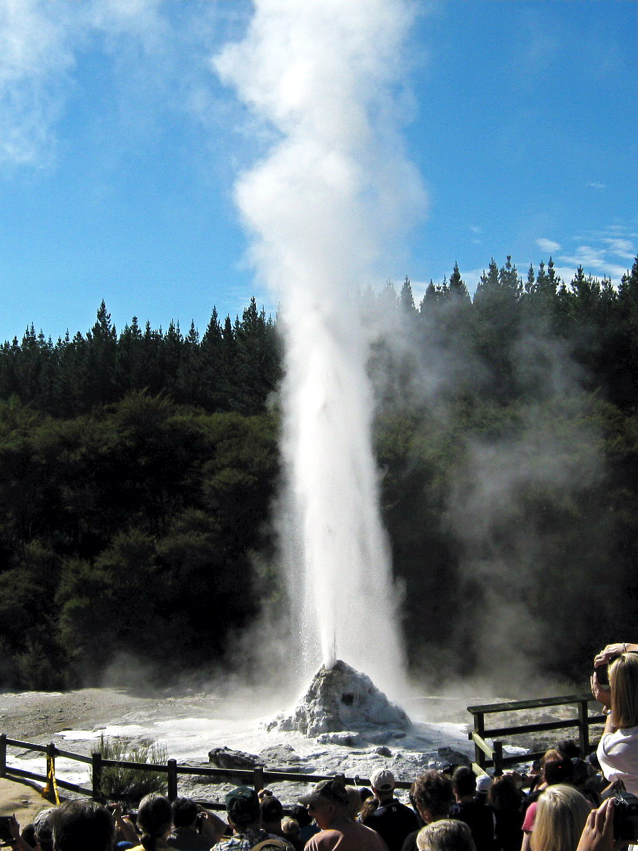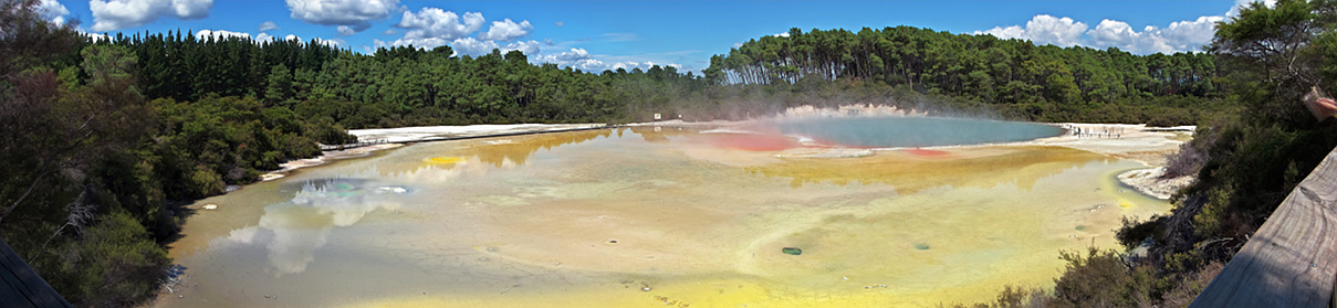 Then it was off to Waiotapu ($32.5) for the photography session. Managed to forget to load the cameras with their usual cards, but had all the spare cards with me and the first one worked for Mel. After buying a ticket I returned to my car where a hitchhiker asked me whether I could ferry him to the geyser, which I did (Tilman from near Stuttgart). We were quite early so I was able to try out various different locations before choosing the very back and getting a couple of sequences of the dormant geyser in the process.