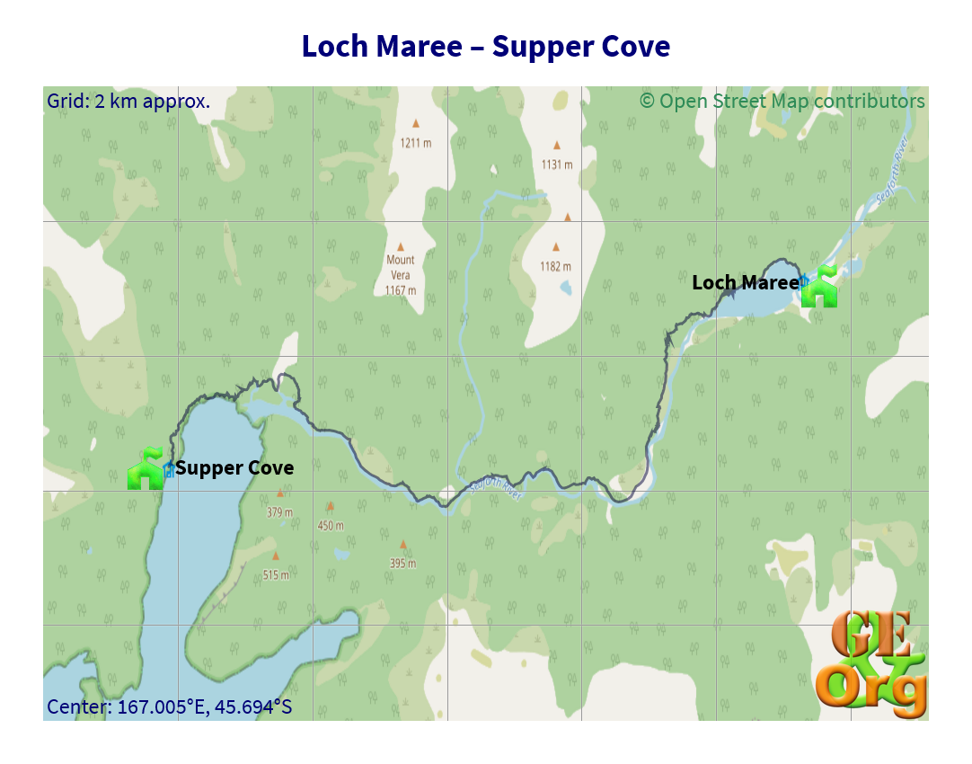 The first two hours were pretty much up and down, around the rockfall that caused Loch Maree. After that the track became very flat and mud-free for a longer stretch, which I used to crunch the kilometres. After about 2½ hours through this section (and beginning to wonder whether all had stayed at Supper Cove) I came across the Canadians, who said they had three hours behind them (I don’t know how they do it. From that point onwards I had another 5½ hours). After the relatively good part it was swampy for a considerable distance and I first met the Dutch couple followed by Jack & Nico who were taking a break at the riverside. I gave Jack his Raybans and he was happy that at least one thing had found its way back to him. I accepted a hug as a reward, then I had my lunch of two muesli bars and the remains of the currants.