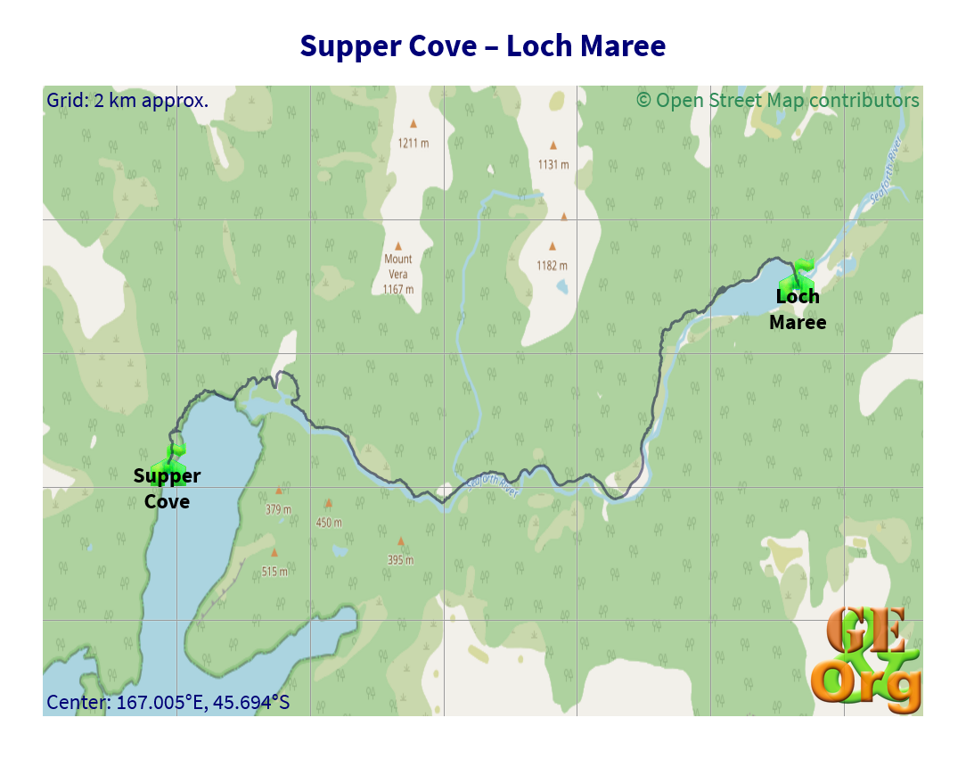 The trip through the swamp was soon over, and the long dry stretches seemed to be much shorter. I had a lunch break @ 13:40 just over one of the regular footbridges, a bit further down the track from the place where I had met Jack & Nico. I could recognise the end of the flat section and there was a bit of climbing around a new section. Finally the flat part towards the hut turned up. I had taken a couple of pictures of the hut across the lake and when I arrived Cathy & Dave and their three friends were there. Somewhat later another couple turned up as well (apparently on their way to Supper Cove), all coming from Lake Roe, also a French woman, Ida, coming from Kintail.
