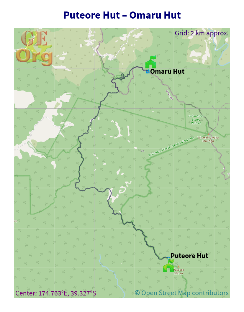 What was signed here was another 1½ hours to the junction with the Matemateoanga Track, then another hour to the hut. But there were still hurdles to overcome. The first hour of the connecting route was both poorly signed and hard to find, although it was recognisable that the track passed through another couple of abandoned farms. After that the signage and findability improved (again contour-following donkey trail) and I arrived at “the road” (Whaka Road – not so dusty as in my imagination but overgrown with grass) and was very soon on another connecting path, which appeared to be a regular tramping path. Then the track itself was there. Signed were 3.4 km/one hour to the hut. I was there in about forty minutes. True tramping track this time, with clearing on either side and a couple of boardwalks. Passed the old hut site and just around the corner was the new.