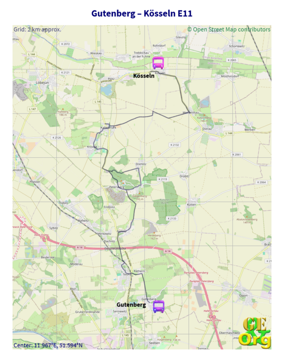 This is where the Luther Path and the E11 part company for good. I had seen some very weathered maps along the way but they were pretty useless. Now, however, the Luther Path went to the right and its signs no longer sported the E11 cross; the E11 crosses went to the left and there was a sign saying Krosigk was the next place in 3 km, with Dessau listed @ 40. I followed the signs to the left and had hopes that the track would go over the top of the hill, but fairly soon it branched off again to the west and I reluctantly followed it. I say “reluctantly” because I was expecting the path to go to the north-east. I ended up doing a complete circuit of the mountain, but no further track could be found and the only village I passed through was Drehlitz. Back at Petersberg I had my lunch and then decided to head to the next village to the north-west, which was indeed Krosigk, but there were no signs in between, and I had given up the path and taken the road instead. Once there I could ascertain no further signs until I scouted around and there was one, indicating the path had come from the left. In any case it listed the satellite village and Kösseln in 6 km as the next goals. No signs could be seen until right in the middle of Kaltenmark and they continued for a very short time before disappearing again. I checked and double-checked. Plötz didn’t seem to be on the path, so that left three villages whose church spires I could see as candidates. I took the middle one. Shortly before the villages were close enough to grasp, a cycle path turned up (Halle – Petersberg – Fuhnen) and it had to be followed for about 100 m before I took a left turn and then a right. The village was not Kösseln but Ostrau, and Kösseln was indeed to the left – another 3 km on the road.