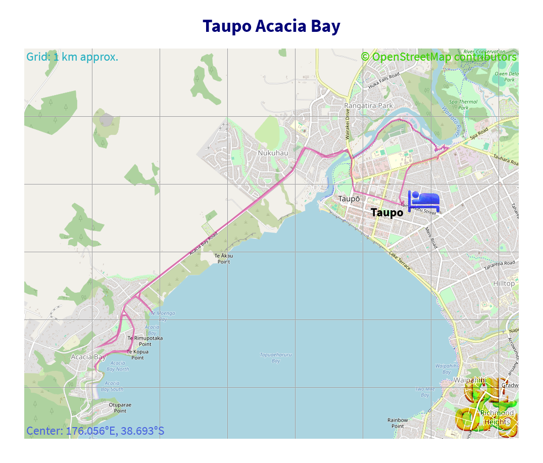 A bit of a relief to be off the main road. and even to get onto the cycle track. Have to see whether the holiday park is the one I stayed at in 2010; in any case I took a closer look around and went as far as the Acacia Bay beach, where Taupo Kayaking Adventures, 2/876 Acacia Bay Rd, is located – closed for the day, unfortunately, because it would have been a lovely day for a paddle, and I was in the right gear and was already covered in sunscreen. Took a few pix here, then set off back to town, and along the riverside cycle path to Taupo Bungy, 202 Spa Rd. I would have liked to have ridden the cycle track, but it was quite tricky and in some places just too steep. Got some pix there as well.