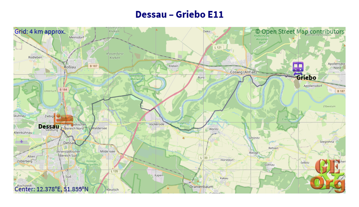 Only a small variation on the other side in Griebo itself, otherwise the path was marked well and sufficiently often enough. I started on the last bottle of lemonade just out of Coswig, and was in Griebo with a good 45 minutes to spare. Now to find the station! I knew it was a little way out of town, but was beginning to doubt its existence at all, when a sign for a level crossing on a side street turned up. I immediately crossed the road and made my way to the railroad tracks and the station was barely 100 m further down the tracks. Spent a good twenty minutes making notes for tonight’s activities in the shade on the wrong platform, then went across in good time for the train.