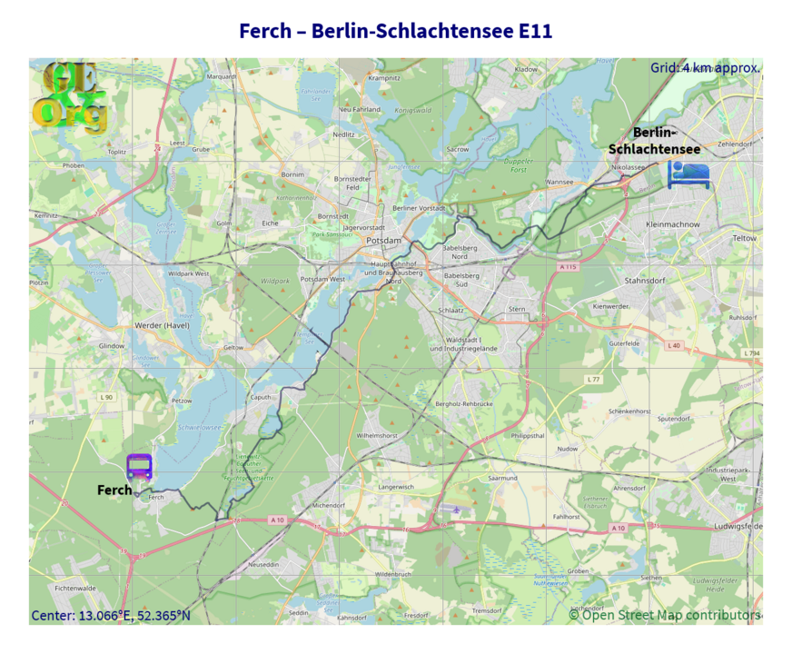 Up until now signs and signposts had been in reasonable condition, but now a slow decline set in. There was road construction at the Templiner Forsthaus and that took a couple of minutes to negotiate. Then the signs became fewer and further apart. I mistook one sign at the rail bridge and followed the wrong tack for about 1 km and had to turn back. For the next couple of kms there were white-red-white signs, but none with blue in them. I marched on nonetheless, and the signs with blue started reappearing just as I entered Potsdam. Here the southwards route of the E10 branches off (another track to try).