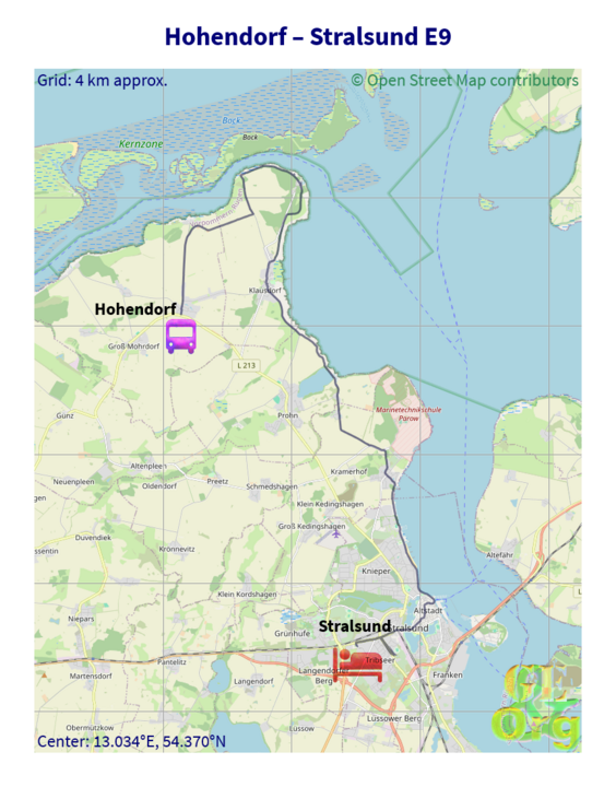 Today’s trip was puzzlingly familiar, as I was expecting it to take a good quarter of an hour more. I had put on the sunscreen, and placed my hat on the pack to do so, and when I saw Hohendorf coming up directly after Prohn, I started the GPS tracker and got ready to get out of the bus. First stop I pushed the button for was Siedlung (a suburb a couple of km down the road) and the bus driver recognised that I had wanted to go a bit further, and the next stop was Hauptstr., where I got on yesterday. Where the remaining fifteen minutes went, no idea. Anyway I was happy to be able to start walking earlier than planned, and in doing so lost the loose hat, which I promptly forgot on the bus, and almost just as promptly regretted not having put on my head.