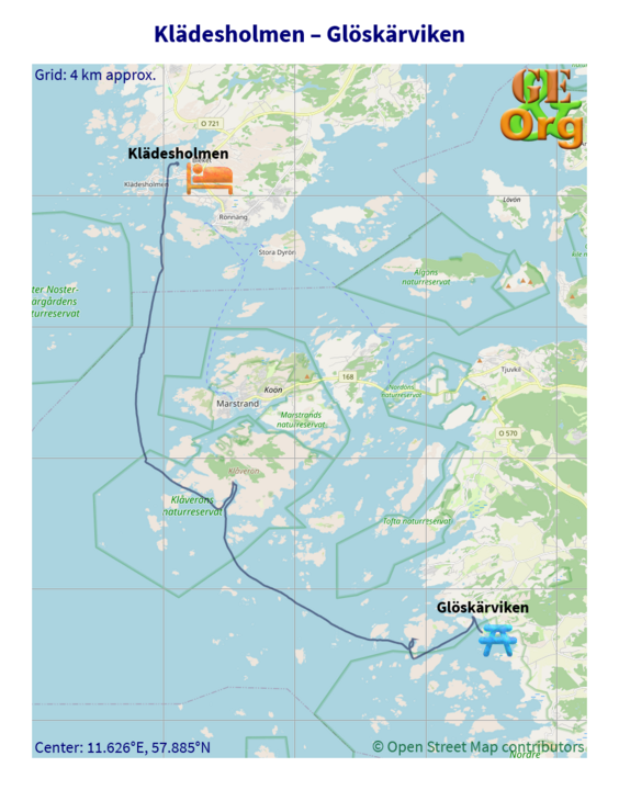 I was having problems with inflamed eyes, although I could not really understand how this hay fever could develop, especially after the rain. My sight was greying out and I had to paddle rather blindly, opening the eyes for only about a quarter of the time. I had tried half a cetirizin tablet for lunch, and that initially provided but little improvement. Towards the end of the crossing we approached an island, and the buildings seemed to be familiar: It was indeed Brunskär, which we had paddled through just over a week ago. The circumnavigation of Orust and Tjörn was now complete.