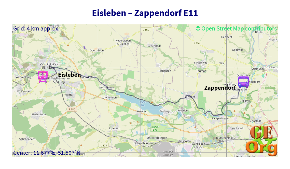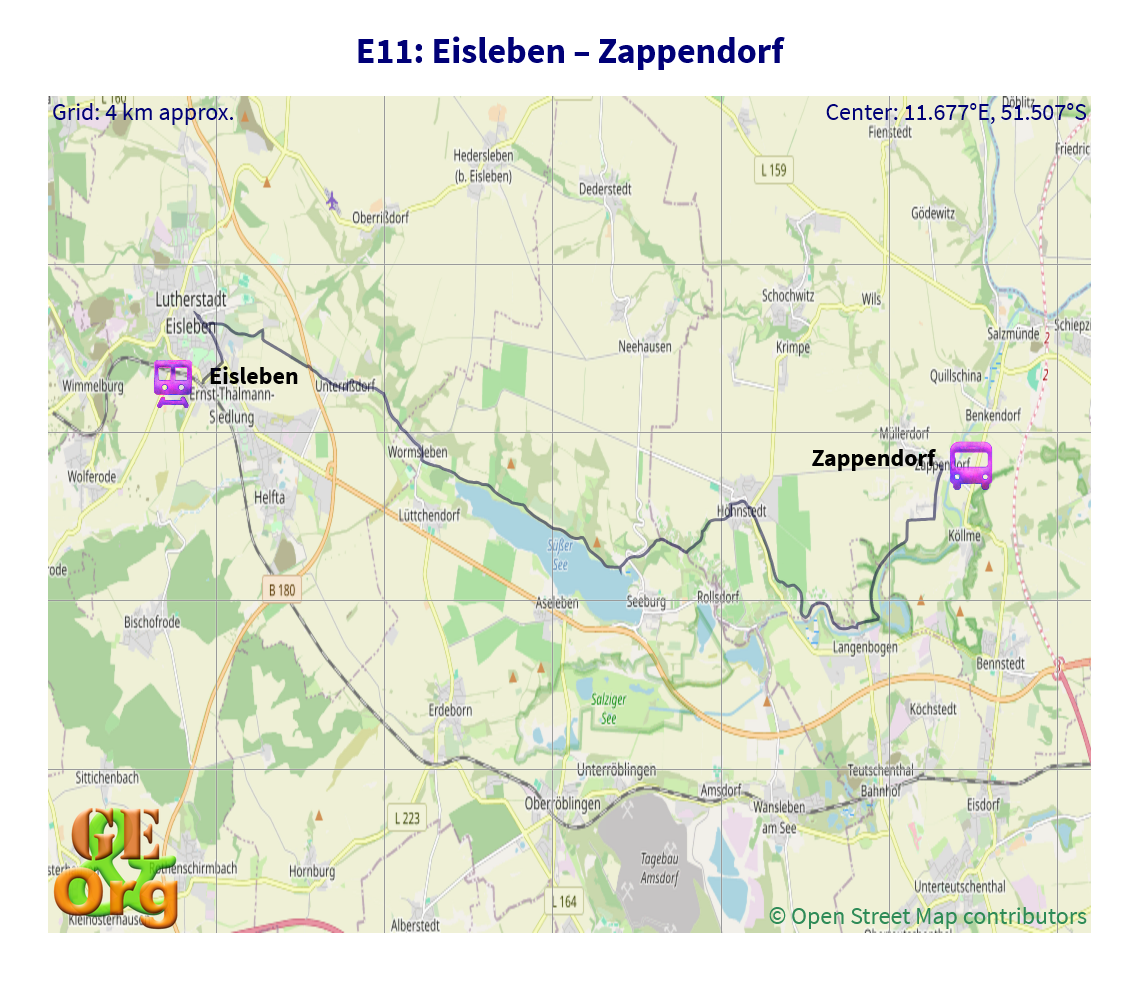 Just before Zappendorf the Luther Path signs (many of which had the X11 posted over) reappeared, together with a map that I did my best to interpret. Seems like the E11 does take an arch to the north at Höhnstedt, and indeed I met it on the way into Zappendorf, complete with all the painted “X” that had been missing for so long. But why all the Luther Path signage? Obviously the tracks are identical from (just before) Eisleben to Höhnstedt. Here it might have helped to have had internet access last night and put a few images on the camera, or at least make some notes about the track. In any case I was now back on track, with another task in another four years.